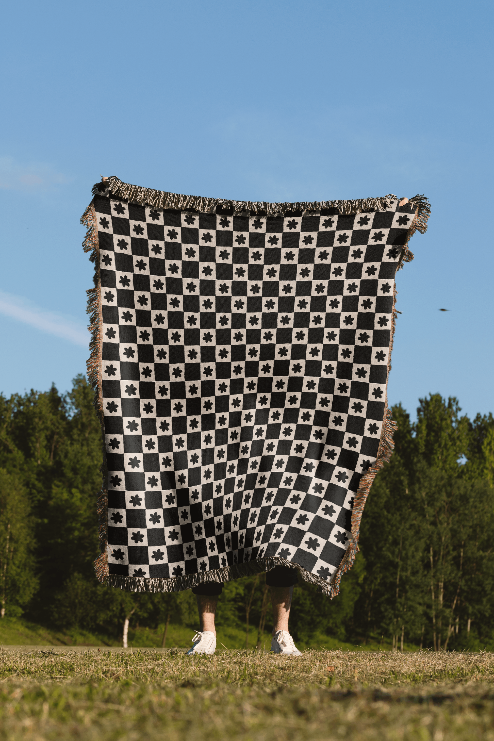 Retro Black and White Floral Check Cotton Throw Blanket from the 1960s
