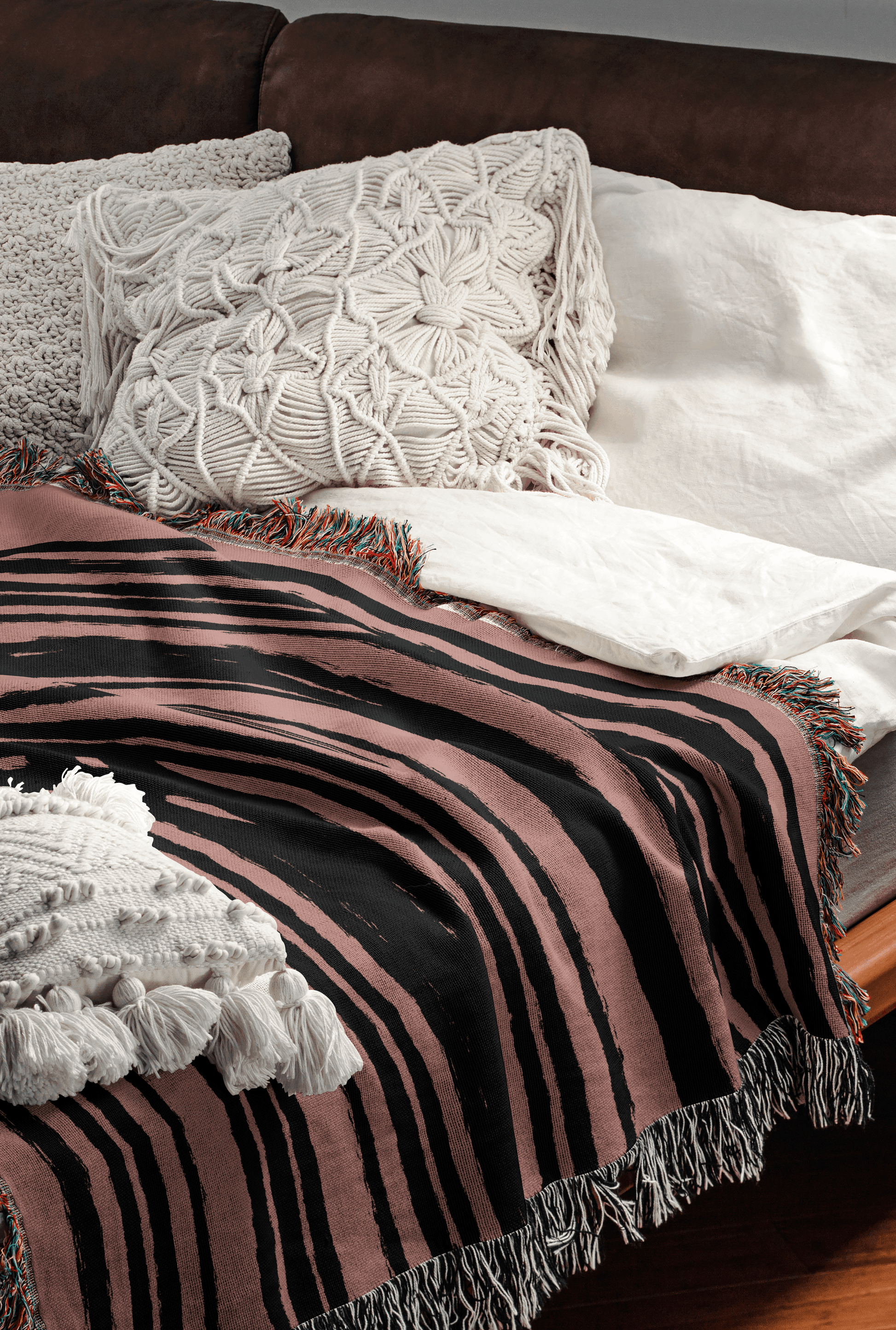 Organic Ring Pattern Woven Cotton Blanket in Dusty Rose and Black