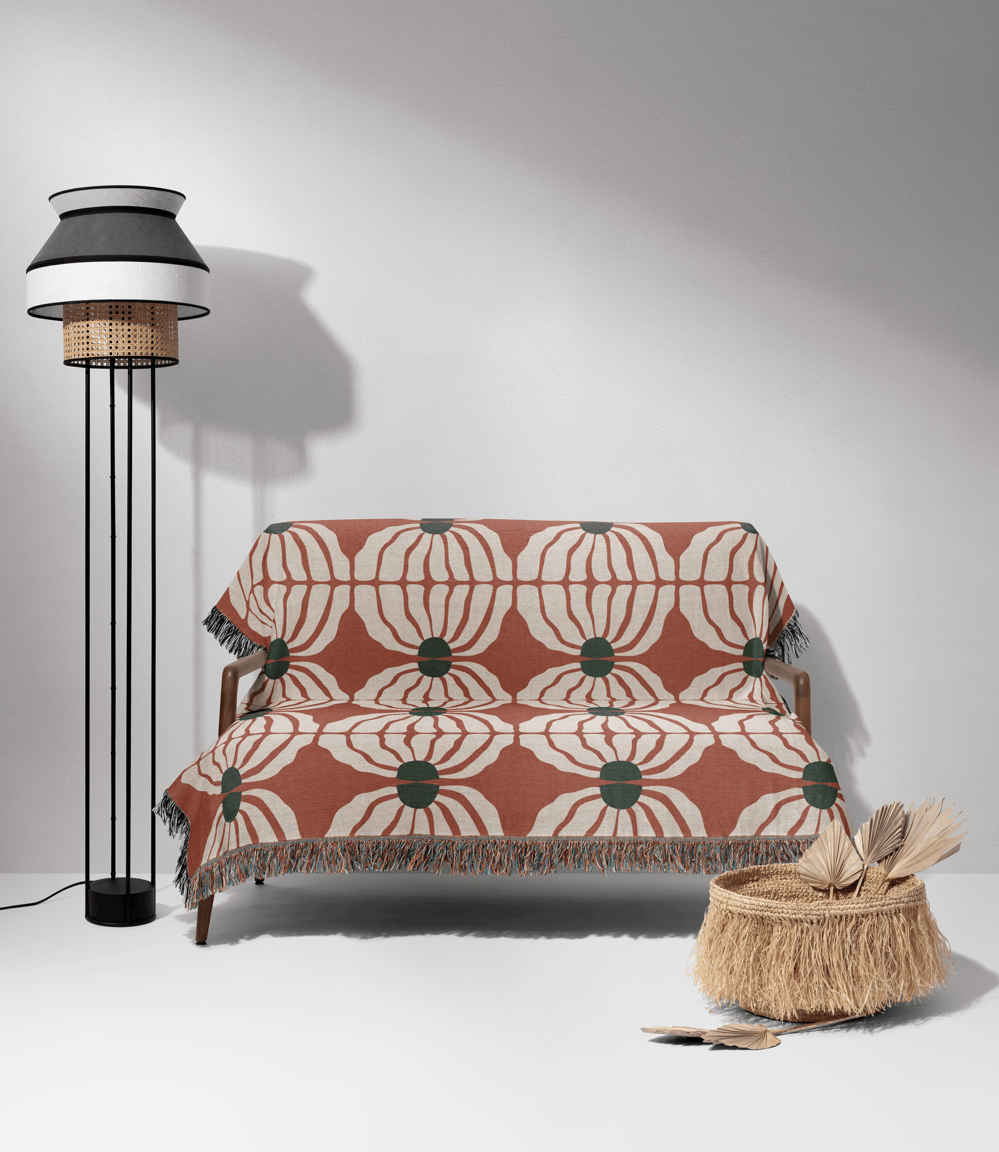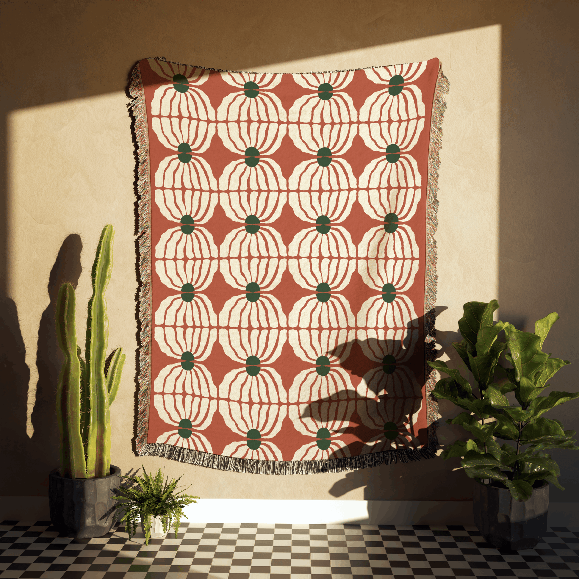 Retro Bloom Woven Cotton Blanket in Terracotta, Green, and White